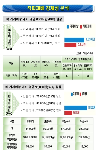 충청남도농업기술원 조사 결과, 기존 모내기 방법보다 드론담수산파 83%, 무논점파 60%, 건답점파 54% 경영비가 절감되는 것으로 나타났다.