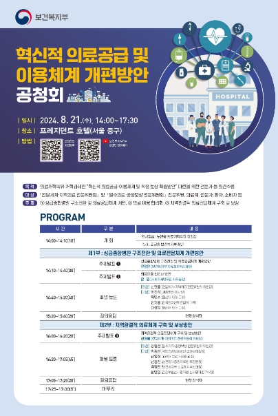[뉴스서치] 정부는 8월 21일 14시 프레지던트 호텔(서울 중구 소재)에서 의료개혁특별위원회(이하 의료개혁특위) 주관 '혁신적 의료공급 및 이용체계 개편방안 공청회'를 개최했다.