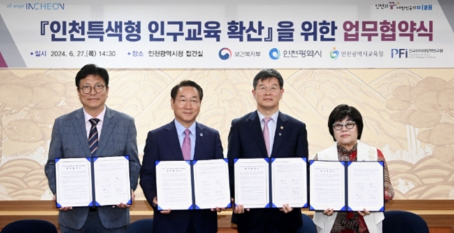 [뉴스서치] 인천광역시는 6월 27일 시청 접견실에서 보건복지부, 인천시교육청, 인구와미래정책연구원과 ‘인천특색형 인구교육 확산 업무협약’을 체결했다고 밝혔다.