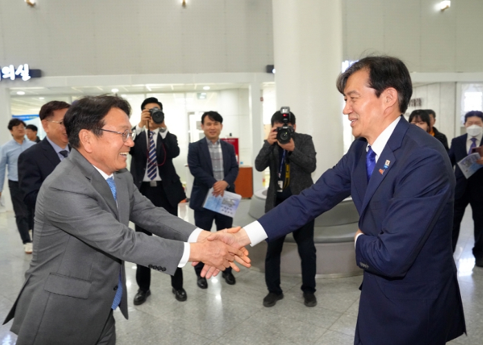 ▲ 강기정 광주광역시장이 23일 오전 ‘조국혁신당 당선인 현안간담회’ 참석차 시청을 방문한 조국 대표와 악수를 하고 있다. /광주광역시 제공 |