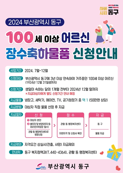 [뉴스서치] 부산 동구는 부산시 16개 구・군중 최초로 100세 이상 어르신들의 장수를 기원하고 경로효친 사상을 고취코자 2024년 7월부터 100세 이상 어르신들에게 장수축하물품을 지원한다.