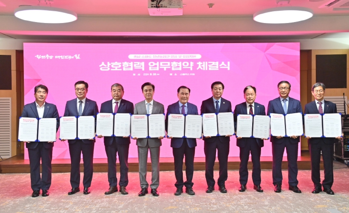 도는 24일 스플라스리솜에서 도교육청, 총남대, 국립공주대, 연암대, 도립대, 농림수산식품교육문화정보원, 한국농업기술진흥원, 농협중앙회 충남세종본부와 ‘충남 스마트 청년농업인 양성 및 유입 지원 상호협력 업무협약’을 체결했다.