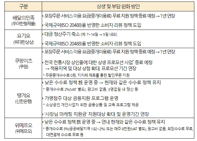 ▲ 배달 플랫폼 사업자별 상생 및 부담 완화 방안 |