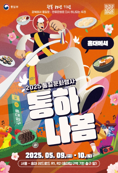 [뉴스서치] 통일부는 5월 9일부터 10일까지 서울 홍대 레드로드 광장에서“광복 80년 기념, 한류문화로 다시 하나되는 우리 - 광복에서 통일로”라는 주제로 2025년 통일문화행사 「홍대에서 통하나봄」을 개최한다.