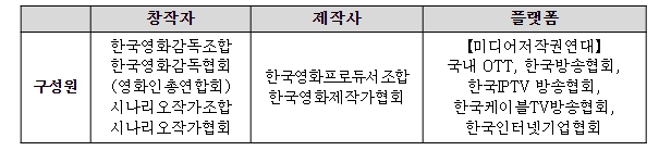 특히 지난해 9월부터 영화감독, 시나리오 작가 등 영화 창작자들과 제작사 협‧단체를 비롯해 국내 온라인동영상서비스(OTT), 케이블‧아이피 티브이(IP TV), 지상파 방송 등 플랫폼(영상제공자) 관계자들과 여러 차례 개별 간담회를 통해 상생협의체 발족을 준비해왔다. 지난 12월에 발표한 ‘저작권 강국 실현 4대 전략’에서도 창작자 권익 강화를 위해 합리적인 보상 체계를 마련하는 것을 핵심 과제로 삼아 문제 해결 의지를 다진 바 있다.