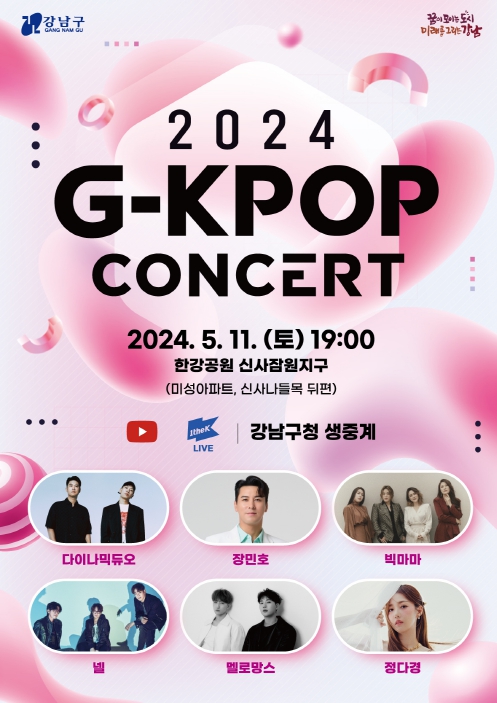 [뉴스서치] 꿈이 모이는 도시, 미래를 그리는 강남구가 5월 11일 저녁 7시에 한강공원 신사잠원지구(미성아파트, 신사나들목 뒤편) 다목적 운동장에서 G-KPOP 콘서트를 개최한다.