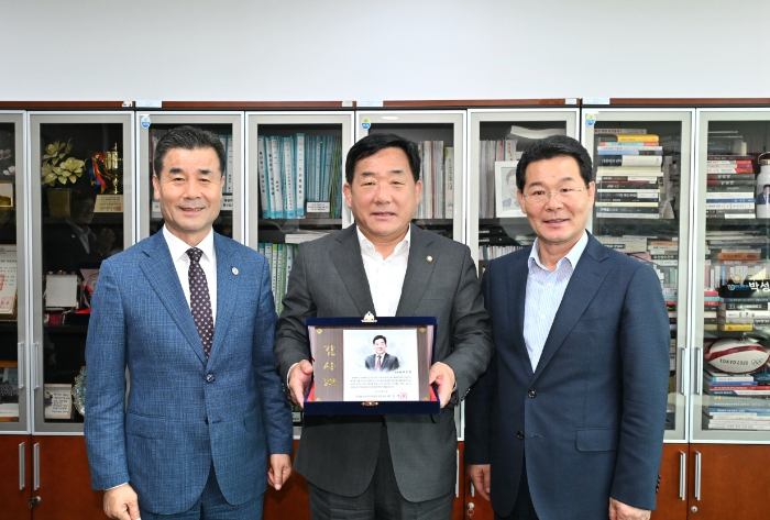 [뉴스서치] 전국원전인근지역 동맹 행정협의회(회장 김영길 울산 중구청장, 부회장 권익현 전북 부안군수)가 6월 26일 오후 4시 50분 국회를 방문해 박성민 국회의원에게 감사패를 전달했다.