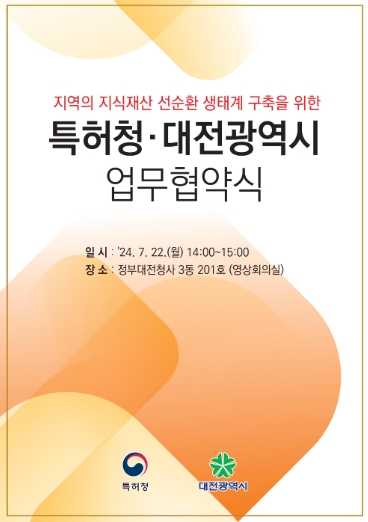 [뉴스서치] 특허청과 대전광역시는 7월 22일 14시 정부대전청사(대전시 서구)에서「지역의 지식재산 선순환 생태계 구축을 위한 업무협약」을 체결했다.