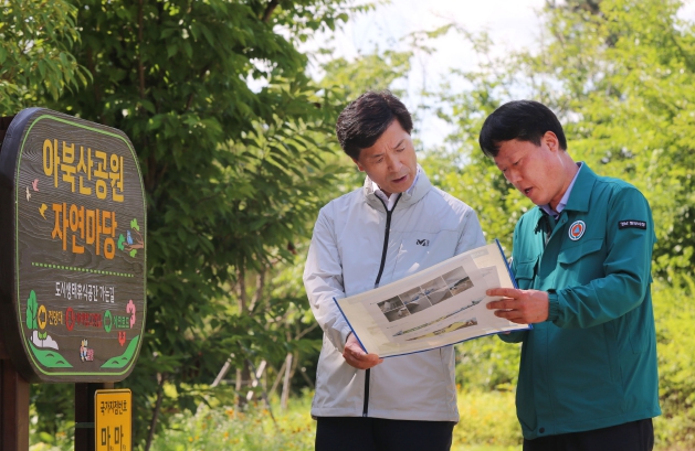 | ▲ 안병구 밀양시장(사진 왼쪽)이 지난 5일 아북산공원 자연마당을 찾아 김상우 환경관리과장으로부터 사업 현황을 보고받고 있다. |