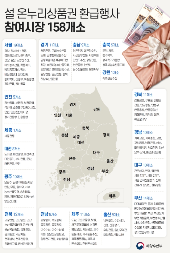 [뉴스서치] 해양수산부는 설 명절 소비자 물가부담 완화를 위해 1월 23일부터 27일까지 전국 158개 전통시장에서 ‘설맞이 전통시장 온누리상품권 환급행사’를 개최한다.