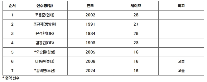 ▲ 역대 신인선수 10세이브 이상 선수(2024. 8.19 기준) |
