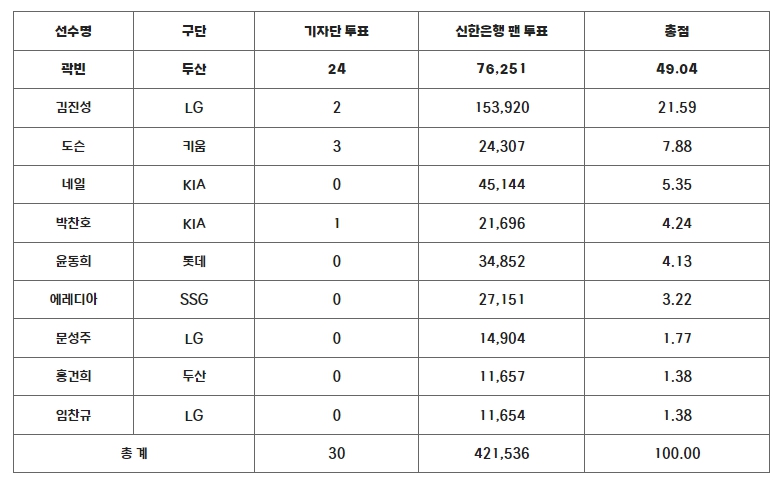 기자단 투표 총 30표 중 24표(80%), 팬 투표 42만 1,536표 중 7만, 6,251표(18.1%)로 총점 49.04점을 받은 두산 곽빈은 기자단 투표 2표, 팬 투표 15만 3,920표로 총점 21.59점을 기록한 2위 LG 김진성을 제치고 5월 월간 MVP로 선정됐다.