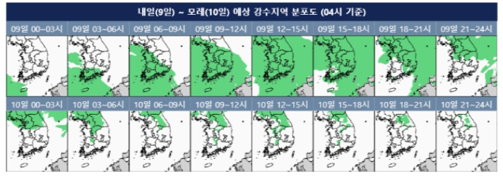 ▲ 내일(9일)∼모레(10일) 예상 강수지역 분포도 |
