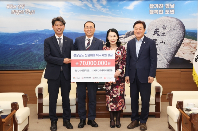 [뉴스서치] 경상남도는 8일 대한건축사협회와 소속 경상남도건축사회 및 17개 시도건축사회가 경남 지역 산불 피해 주민들을 돕기 위한 성금 7천만 원을 기탁했다고 밝혔다. 성금 전달식은 이날 오후 3시 30분, 경남도청에서 열렸다.