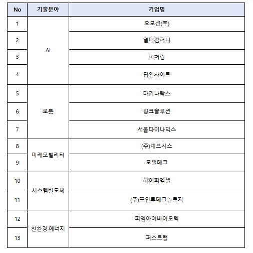 이번 행사에는 최근 일본에서 투자 수요가 높고 기술적 주목을 크게 받고있는 인공지능(AI), 로봇, 미래 이동수단(모빌리티), 시스템반도체, 친환경·에너지 등의 핵심 분야에서 높은 기술력을 보유한 시리즈 A 이상의 초격차 창업기업(스타트업) 13개사가 참여했다.