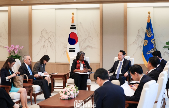 ▲ 4월 15일 윤석열 대통령은 방한 중인 「린다 토마스-그린필드(Linda Thomas-Greenfield)」 주유엔 미국대사를 접견하고, 유엔 안보리 이사국 활동, 한미 동맹, 북한 문제 등에 대해 의견을 교환했다. |
