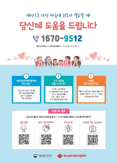 이번 지진으로 마음이 힘든 국민은 누구든지 시․도 재난심리회복지원센터에 방문 또는 전화(1670-9512)하면 심리상담을 받을 수 있다.