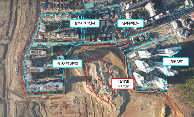 이에 암반의 3면을 ‘디귿’자 형태로 둘러싸고 있는 주변 아파트와 빌라 주택 단지의 2,600여 세대 주민들은 발파로 인한 주택 균열, 소음·진동·분진 등 생활환경 피해가 우려된다며 LH와 관계기관에 지속해서 민원을 제기했지만, 해결의 기미가 보이지 않자 발파반대비상대책위원회 위원장을 비롯한 3,128명의 연명으로 지난해 5월 국민권익위에 집단민원을 제기했다.