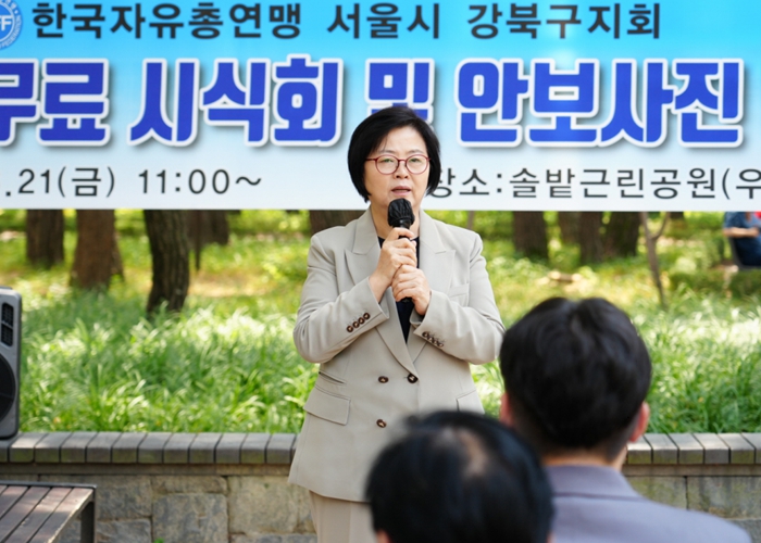 ▲ 이순희 서울 강북구청장이 '6.25 전쟁음식 시식회 및 안보사진 전시회'에서 인사말을 전하고 있다. |