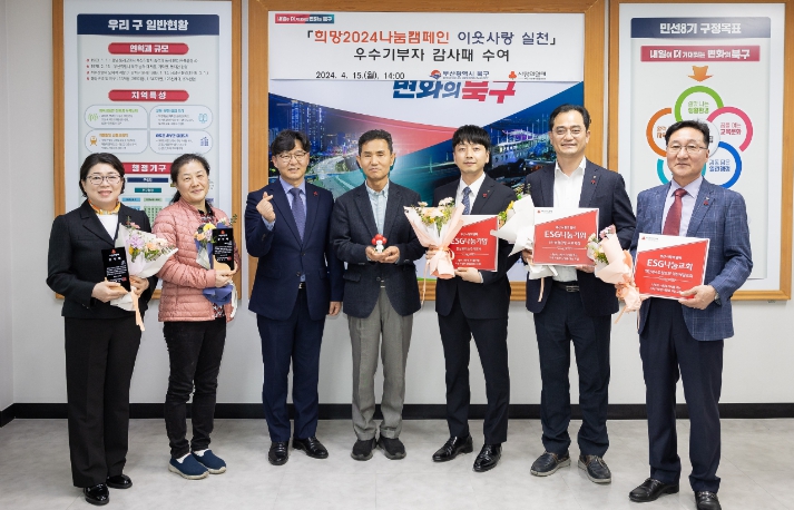 [뉴스서치] 부산 북구는 희망2024나눔캠페인 이웃사랑 실천 우수 기부자에게 부산사회복지공동모금회(회장 최금식) 감사패를 수여했다고 밝혔다.