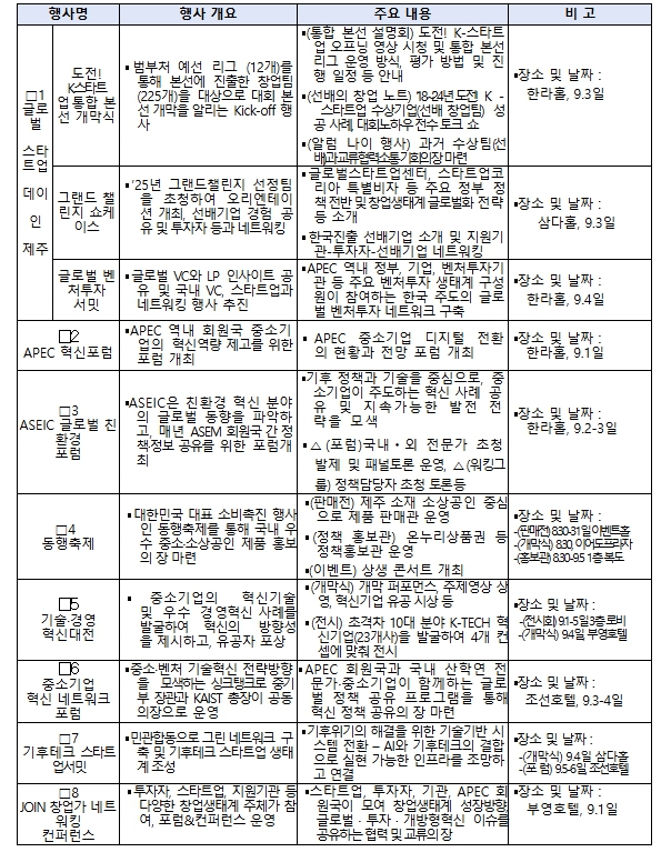 또한 ‘APEC 장관회의 주간’에는 사전행사인 동행축제 개막식(8.30-31)을 시작으로 ‘Global Startup Day in Jeju’, 기술경영혁신대전 등 중소·벤처기업 및 소상공인을 아우르는 8개의 중기부 대표 행사들이 함께 개최될 예정이다.
