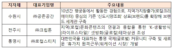 ‘세방화(글로컬) 상권 창출팀’ 에는 수원(대표기업 공존공간), 전주(대표기업 크립톤), 통영(대표기업 로컬스티치) 3개팀이 선정됐으며, 선정된 팀들은 지역가치창출가(로컬 크리에이터), 소상공인, 지역주민 등과 협력하여 국내외 관계인구를 끌어들이는 명품 상권을 만들 계획이다.