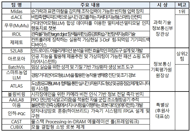 손가락에 반지형 지능형(스마트) 입력 장치(MidasRing)를 착용한 상태에서 책상, 벽 등 주변의 어떠한 표면 위에서도 손가락을 움직이기만 하면 컴퓨터의 마우스 커서를 조작할 수 있는 기술을 구현하여 1위를 차지한 Midas팀(한국과학기술원, KAIST)을 비롯하여 d.ACE(경북대), 무무(MuMu, 포항공대), IROL(숭실대), 제페토(한국과학기술원, KAIST) 팀이 과기정통부 장관상을 수상했다. 해당 팀에게는 내년 1월 미국 라스베이거스에서 개최되는 국제전자제품박람회(CES 2026) 참관 기회가 제공되며, 특히 1위 팀에게는 한국형 정보통신기술 창업 지도센터(K-ICT 창업멘토링센터)에서 제공하는 창업 지도(멘토링) 프로그램 참여 시 가점이 부여된다.