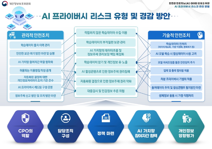 개인정보보호위원회는 AI 기업이 자율적으로 프라이버시 리스크를 관리할 수 있도록 '안전한 인공지능(AI)·데이터 활용을 위한 AI 프라이버시 리스크 관리 모델'(‘리스크 관리 모델’)을 공개했다. 이러한 리스크 관리 모델에는 AI 생애주기에 걸친 프라이버시 리스크 관리의 방향과 원칙, 리스크 유형, 경감방안을 체계적으로 담았다.