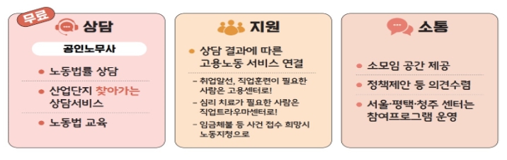 특히, 청주센터는 인근 청주·오창 과학산업단지 내 반도체 제조 관련 종사자들을 대상으로 다양한 특화 프로그램을 진행할 예정이며, 미조직 근로자들의 근무 여건을 고려하여 평일 저녁과 토요일에도 운영한다.