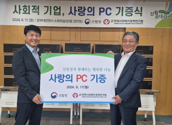 [뉴스서치] 산림청은 정부대전청사에서 컴퓨터를 비롯해 총 239대의 전산기기를 사회적기업인 (사)한국사회복지정책연구원에 무상으로 기증하는 ‘사랑의 컴퓨터 기증행사’를 가졌다고 17일 밝혔다.