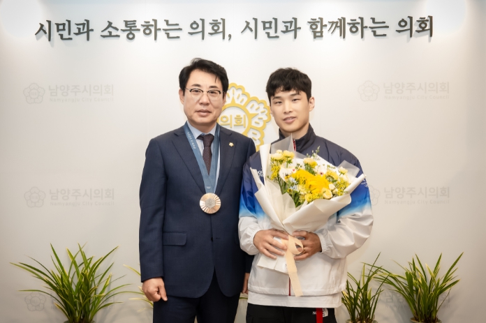 ▲ 남양주시의회 조성대 의장은 파리올림픽 유도 단체전에서 동메달을 획득한 안바울 선수를 격려했다. |