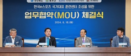 경상북도와 예천군은 18일 예천군청에서 한국e스포츠협회(KeSPA), ㈜KT와 e스포츠 국가대표 훈련센터 조성을 위한 업무 협약을 체결했다.