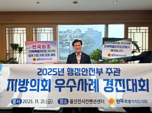 [뉴스서치] 전북특별자치도의회가 지난 21일 울산전시컨벤션센터에서 열린 행정안전부 주관 ‘2025년 지방의회 우수사례 경진대회’에서 본선에 진출해 수상하는 영예를 안았다.