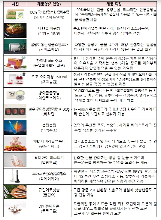 이어진 상품기획가(MD) 등 민간 전문가들의 시장·상품경쟁력, 가격 적정성, 가치성 등 적격성 평가를 통해 우수한 제품을 가진 중소기업·소상공인 300개사를 최종 선정했으며,백년가게 제품(따귀탕), 건강쥬스, 떡볶이 등 온 가족이 함께 즐길 수 있는 식품·간식류와 안구 미스트기, 종이드론, 에코칫솔 등 혁신 제품군들이 선정됐다.