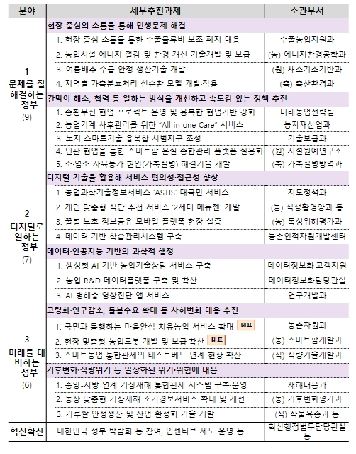 농촌진흥청은 국민과 소통하며 농업·농촌 현장의 문제를 빠르게 해결하고, 국민이 체감할 수 있는 성과 창출을 위해 3대 전략*에 따라 총 22개 세부 과제 추진에 역량을 집중하기로 했다.