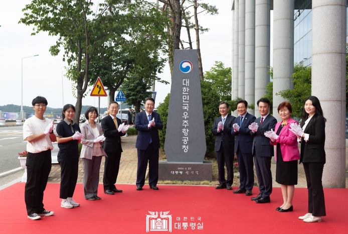 대통령은 이어 우주항공청 임시청사로 이동해 청사 입구에서 우주항공청 및 유관 기관 주요 관계자, 시민들과 함께 간판석 제막식을 가졌다. 대통령과 참석자들이 사회자의 카운트다운에 맞춰 흰 제막을 내리자, 기관 명칭인 '대한민국 우주항공청'과 하단에 대통령의 친필 서명 및 개청일이 적힌 간판석이 드러났다.