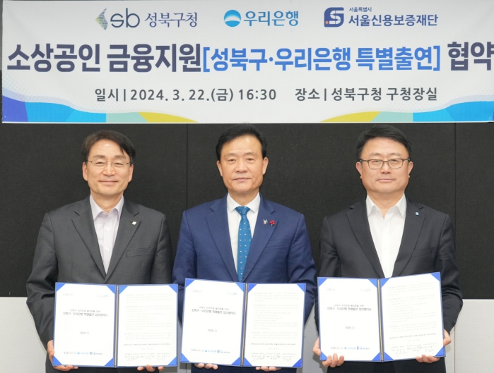 [뉴스서치] 서울 성북구가 22일 성북구 구청장실에서 우리은행, 서울신용보증재단과 함께 ‘소상공인 특별융자 지원 업무협약’을 체결했다.