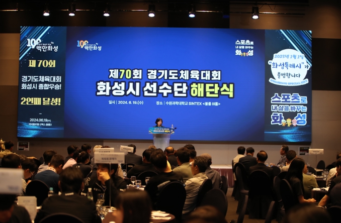 [뉴스서치] 화성시의회는 19일, 수원과학대학교 SINTEX에서 열린 제70회 경기도 체육대회 해단식에 참석해 종합우승을 달성한 화성시 선수단을 축하했다.