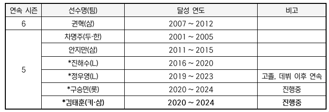 ▲ 연속 시즌 10홀드(5시즌 이상) |