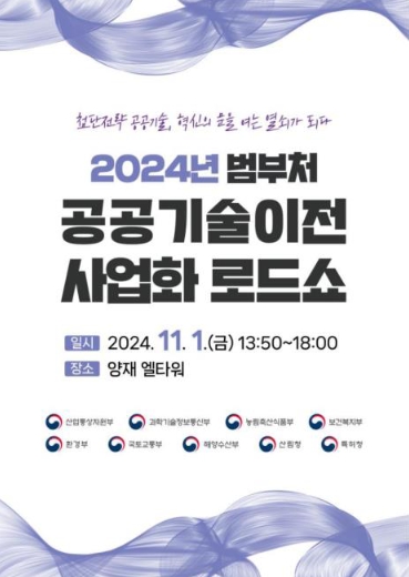 [뉴스서치] 특허청은 과학기술정보통신부, 농림축산식품부, 산업통상자원부, 보건복지부, 환경부, 국토교통부, 해양수산부, 산림청과 공동으로 11월 1일 13시 50분, 엘타워(서울시 서초구)에서 우수 공공기술의 민간 이전·사업화 촉진을 위한 ‘2024년 범부처 공공기술 이전·사업화 로드쇼’를 개최한다고 밝혔다.