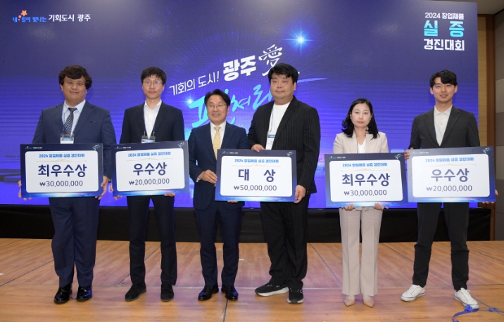 ▲ 강기정 광주광역시장이 14일 오후 김대중컨벤션센터 컨퍼런스홀에서 열린 ‘2024 창업기업제품 실증 경진대회’에 참석해 우수 기업에게 시상한 후 수상자들과 함께 기념촬영을 하고 있다. /광주광역시 제공 |