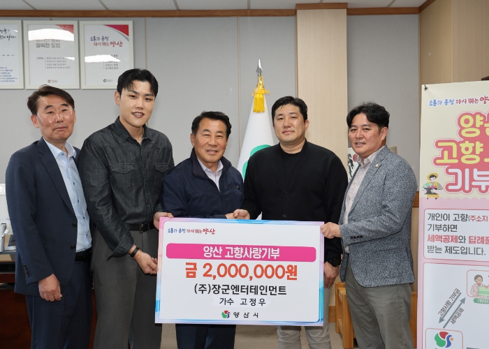 [뉴스서치] 양산시는 ㈜장군엔터테인먼트 소속 가수 고정우가 양산시에 고향사랑기부금 200만원을 기탁했다고 14일 밝혔다.