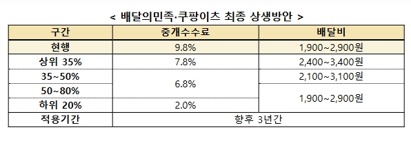 배달의민족과 쿠팡이츠가 제시한 상생방안을 비교하면 다음과 같다.