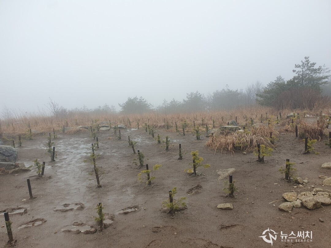 계속 선자령 방향을 향해 산길을 걷다 보니 어린 주목을 식재한 곳이 보였고 그곳을 통과한 뒤 한참을 걸어 오후 2시 53분 넓은 고위평탄면에 펼쳐진 초지와 군데군데 설치된 커다란 풍력발전기가 있는 곳에 도착하였다.