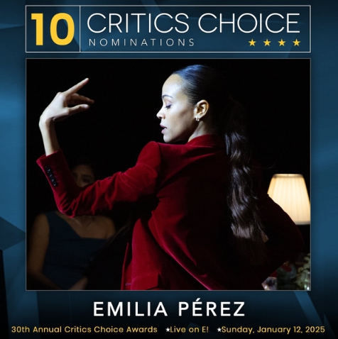 멕시코 마약 카르텔의 수장이 아무도 모르게 여자로 다시 태어나 인생 2막을 시작하며 벌어지는 이야기를 그린 뮤지컬 영화 '에밀리아 페레즈' 가 칸영화제 2관왕, 골든글로브 시상식 10개 후보에 이어, 제30회 크리틱스 초이스 어워즈에서도 10개 후보에 오르는 기염을 토했다.
