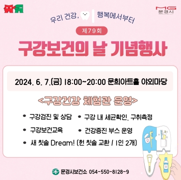 [뉴스서치] 문경시보건소는 구강건강에 대한 지역주민의 인식을 강화하고, 구강보건에 대한 흥미와 관심을 높이고자 “제79회 구강보건의 날”을 맞이하여 오는 7일 오후 6시부터 8시까지 문희아트홀 야외마당에서 구강건강 홍보‧체험 행사를 개최한다.