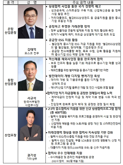납품대금 연동제 확산, 상생결제 활성화, 상생협력기금 출연 확대, 성과공유제 도입 등 동반성장에 기여한 공이 큰 개인 및 기업에 수여됐다.