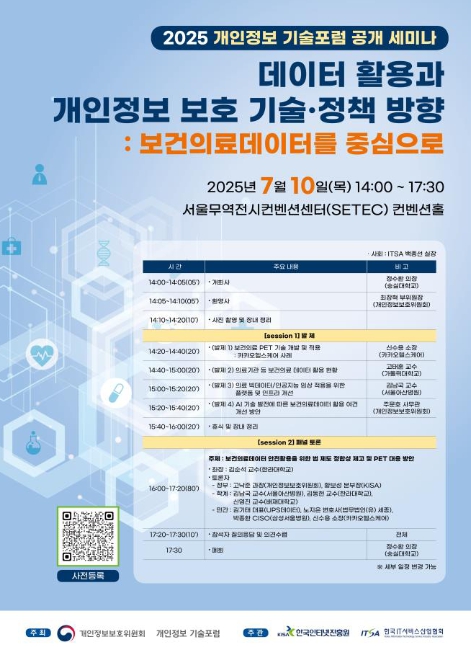 [뉴스서치] 예방 및 맞춤형 의료 패러다임 도입으로, 민감 의료데이터의 활용 가능성에 대한 관심이 높아지고 있다. 개인정보보호위원회는 “데이터 활용과 개인정보 보호 기술‧정책 방향 : 보건의료데이터를 중심으로”라는 주제로, 7월 10일 서울 강남구 소재 서울무역컨벤션센터에서 '개인정보 기술포럼(이하 ‘기술포럼’)*' 공개세미나를 개최했다.