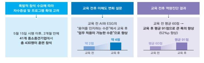 특히, 이번 추경에서는 ‘25년 5월부터 ㄱ 사에서 중소기업을 대상으로 운영하기 시작한 “생성형 인공지능(AI) 서비스개발자 양성”과정처럼 훈련성과가 우수한 중소기업의 인공지능 전환 훈련프로그램 등을 확산하여, 중소기업 근로자의 인공지능 대응력을 높이는 한편, 대·중소기업 간 인공지능 격차 완화를 위한 지원을 강화할 예정이다.