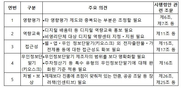 한편, 「디지털 포용법 시행령」 제정안 입법예고는 이번 주 금요일(11.21)까지 진행될 예정이며, 제정안에 대해 의견이 있는 경우 국민 참여 입법센터나 이메일 등을 통해 의견을 제출할 수 있다.
